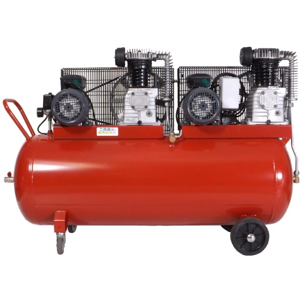 uniek concept met dubbele compressorgroep speciaal voor grote luchtopbrengst waar geen driefasig net voorzien is.elke compressorgroep heeft een stekker om op aparte circuit aan te sluiten.opstart door tijdsvertraging waardoor deze gelijk werken onder alle omstandigheden.aluminium kwaliteitskoppen met gietijzeren cilinder en aluminium koelelement.met condor drukschakelaar en voorzien van drukregelaar.