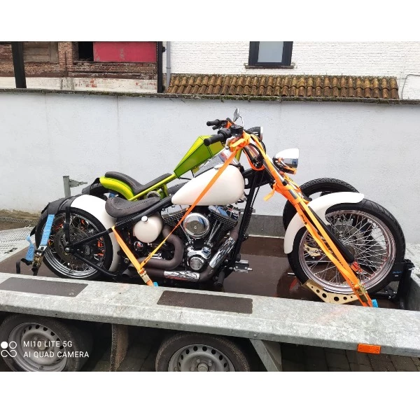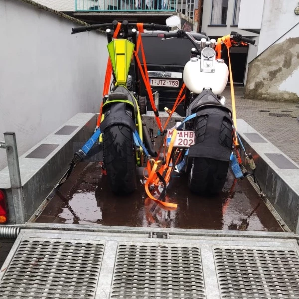 Hiervoor zjin wielsteunen en 4 extra bindogen beschikbaar in het midden van de aanhangwagen