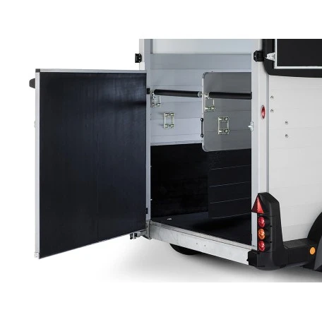 De opbouw en de vloer zijn van geanodiseerd aluminium. Het voorraam i.c.m. met de zijramen bieden uw paard een "panoramische" rondblik. Deze trailer is voorzien van de bekende parabole bladvering, die ervoor zorgt dat uw paard een veilige, comfortabele rit heeft. De achterklep kan open draaien of als een opstapramp neer gelegd worden.