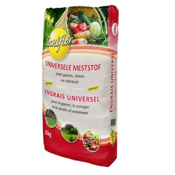 SANIFLOR Universele Meststof, makkelijk te verwerken door zijn korrelvorm, heeft een complete en evenwichtige basisformule NPK 9-7-14S (+3MgO). Deze meststof is een vitaminekuur voor al uw buitenplanten en uw gazon.